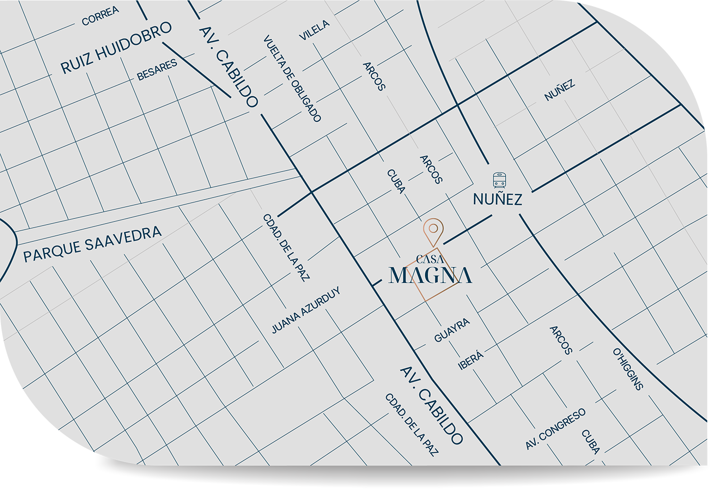 Casa Magna está situada en una zona residencial del barrio de Nuñez, CABA. Su ubicación es estratégica, debido a su proximidad a Av. Cabildo, Av del Libertador, la estación de tren Mitre y el subte (Linea D).